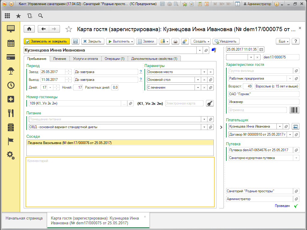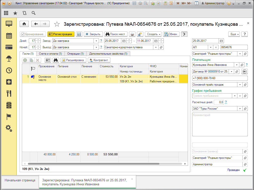 - Настраиваемые параметры пребывания каждого гостя в путевке — вариант проживания, лечения, питания, гостиничный номер.