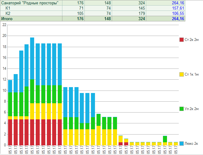 В программе больше 20 предустановленных отчетов по гостинице. Примеры: