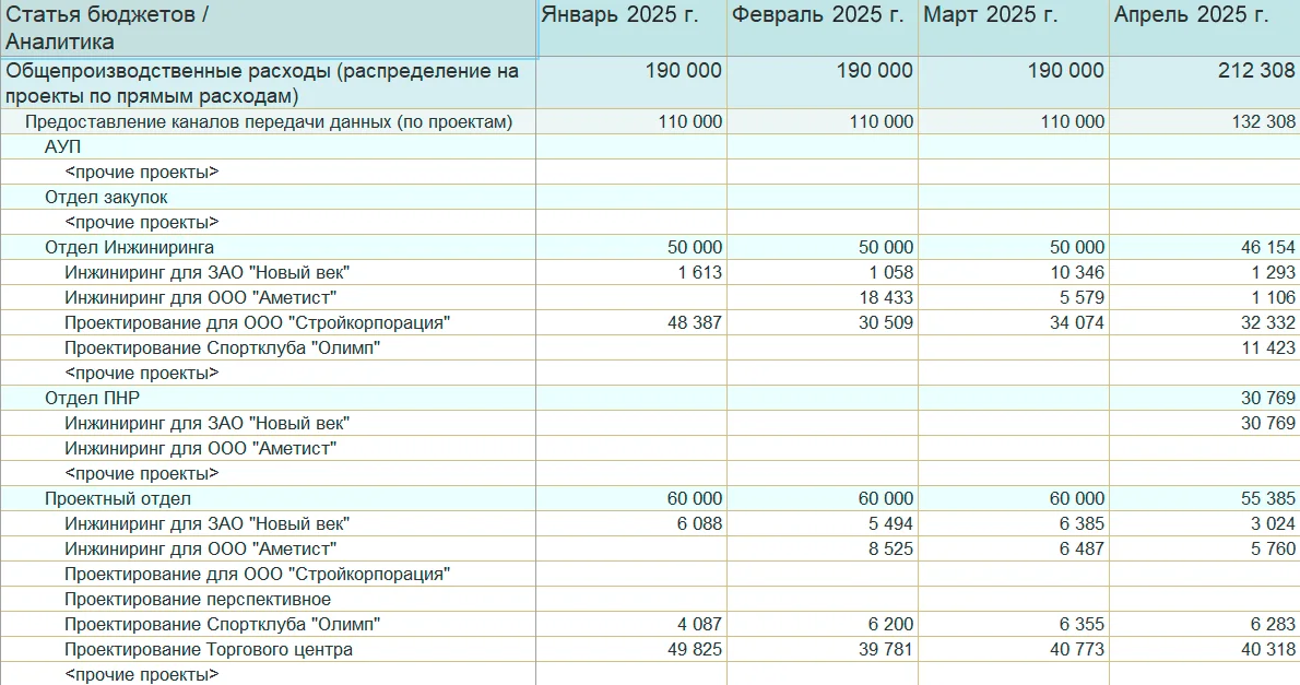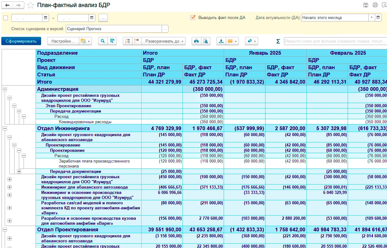 Модуль связывает проектную деятельность с общим финансовым контуром предприятия. Это дает возможность формировать бюджеты по проектам, отражать затраты и заработную плату, а также анализировать экономику компании в разрезе проектов.