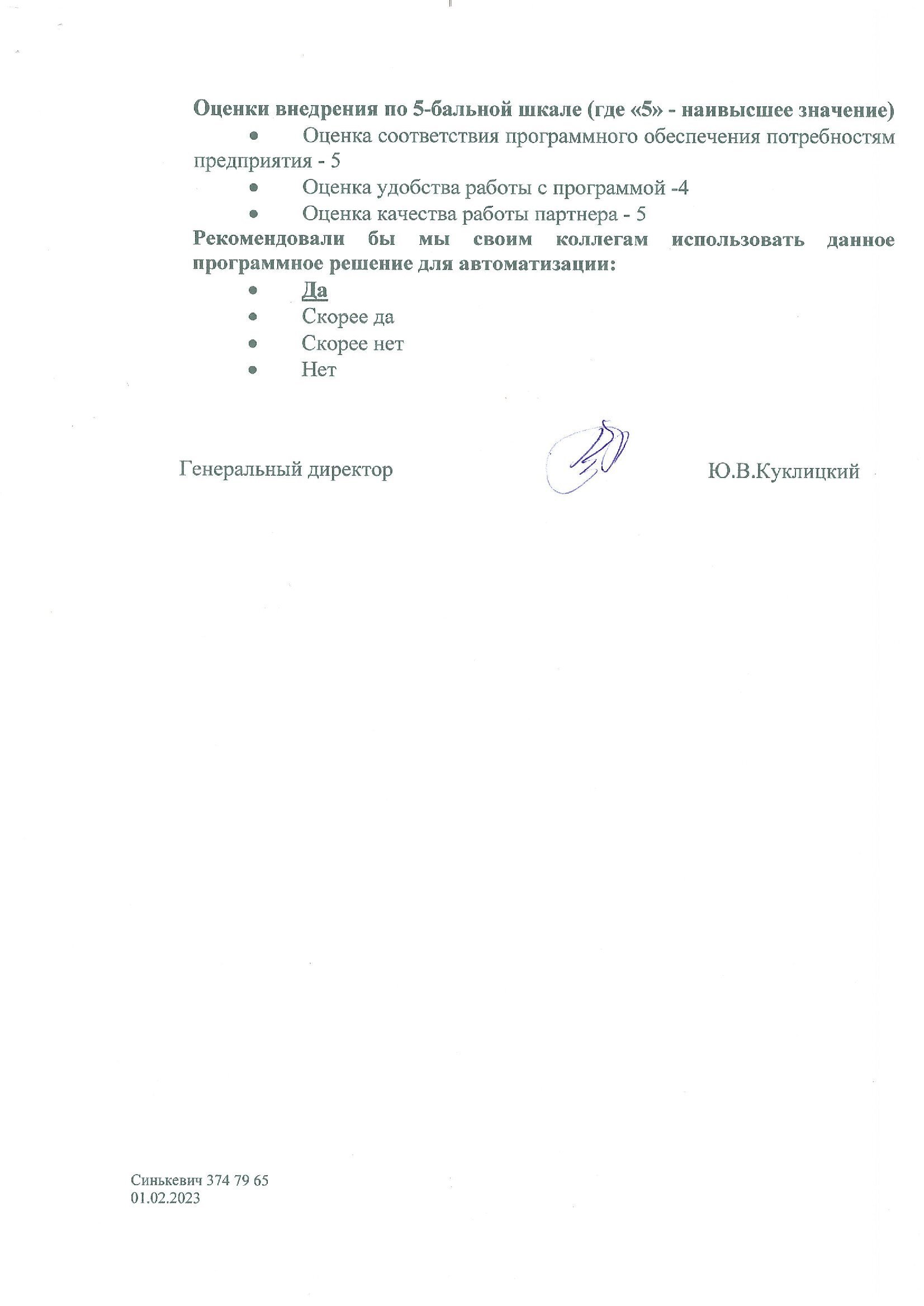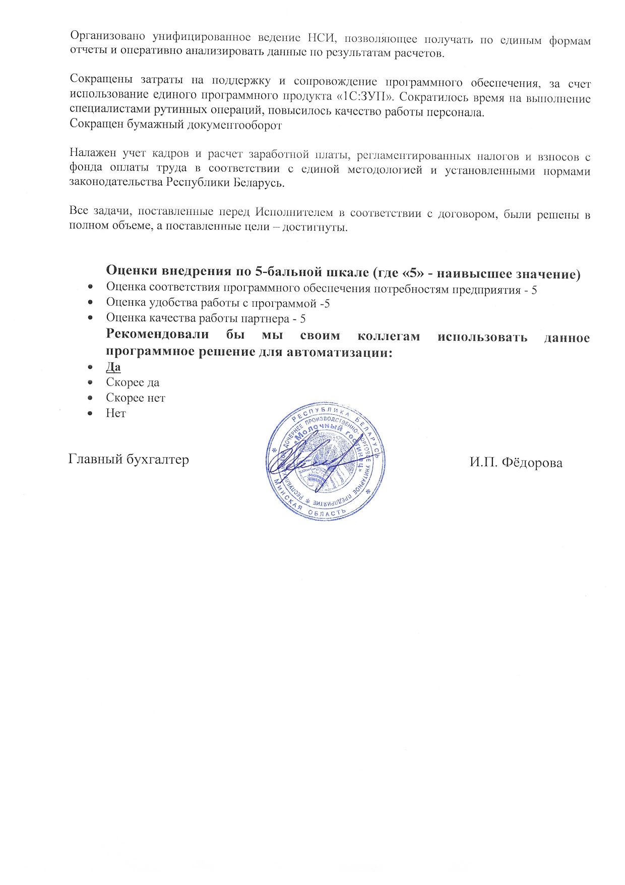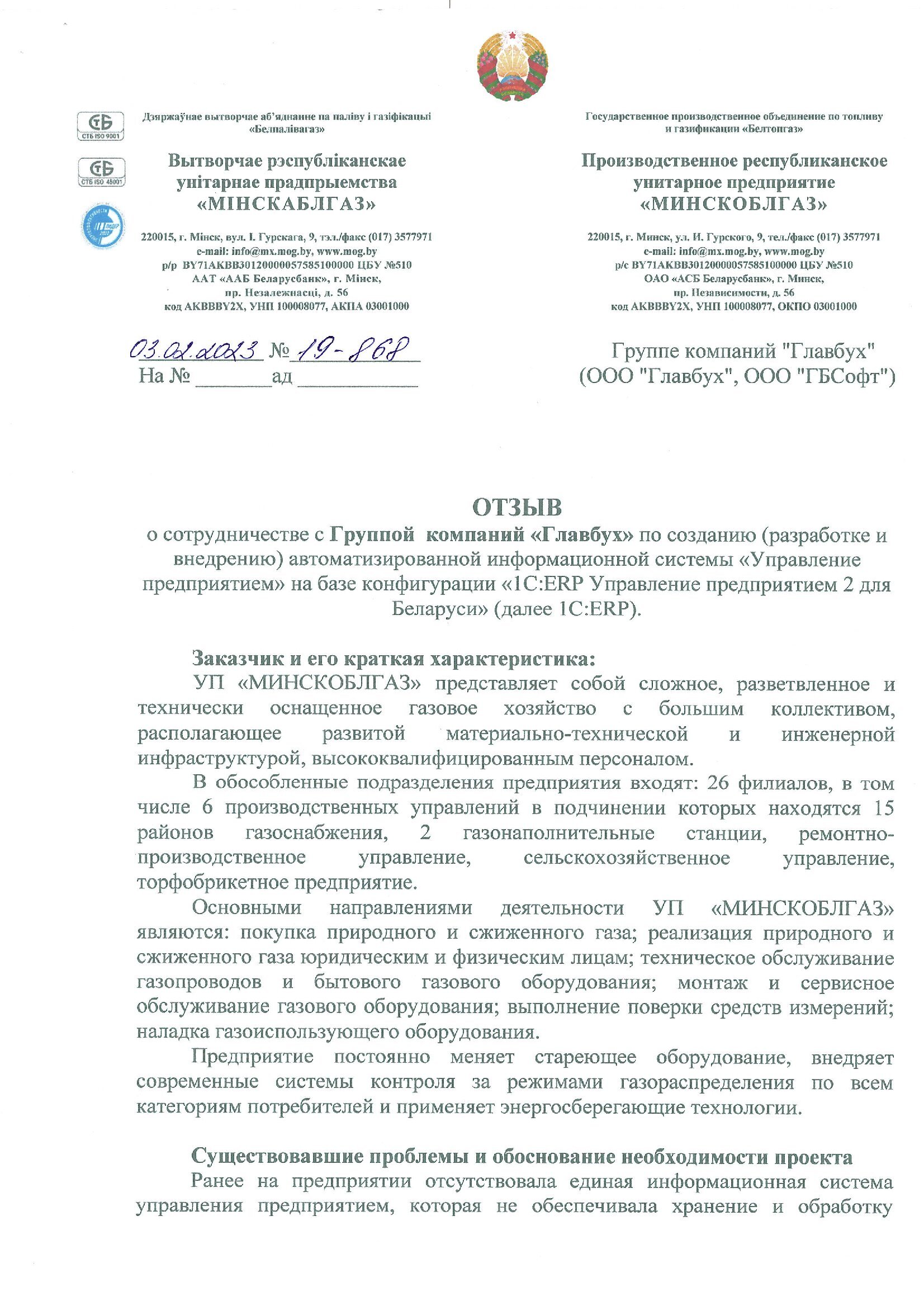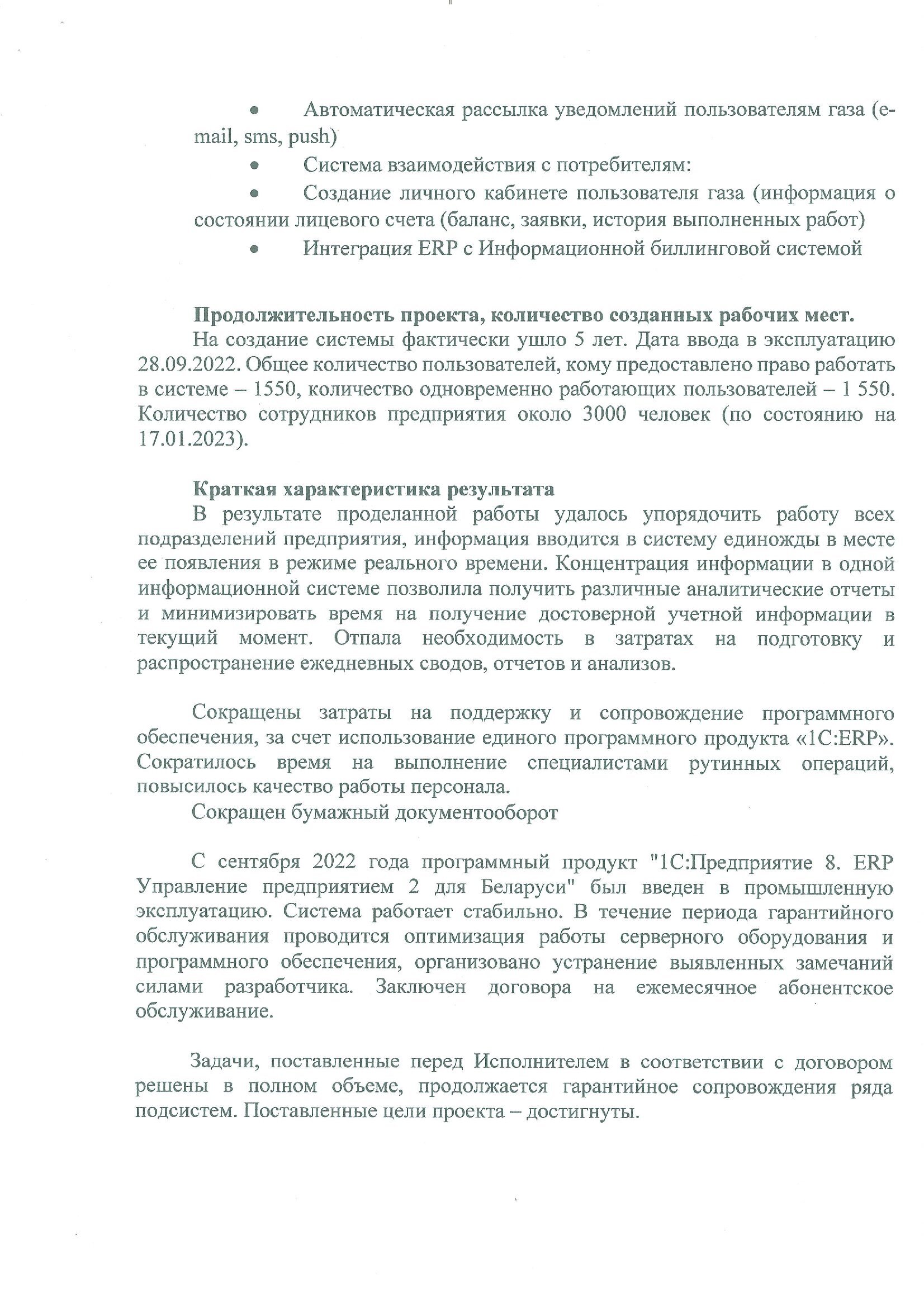 Задачи, поставленные перед ГБСофт, решены в полном объеме. Разработка и внедрение автоматизированной информационной системы "Управление предприятием" на базе конфигурации "1С:ERP Управление предприятием 2 для Беларуси" помогли предприятию упорядочить работу всех подразделений, сократить затраты на поддержку информационной системы и повысить качество работы персонала.