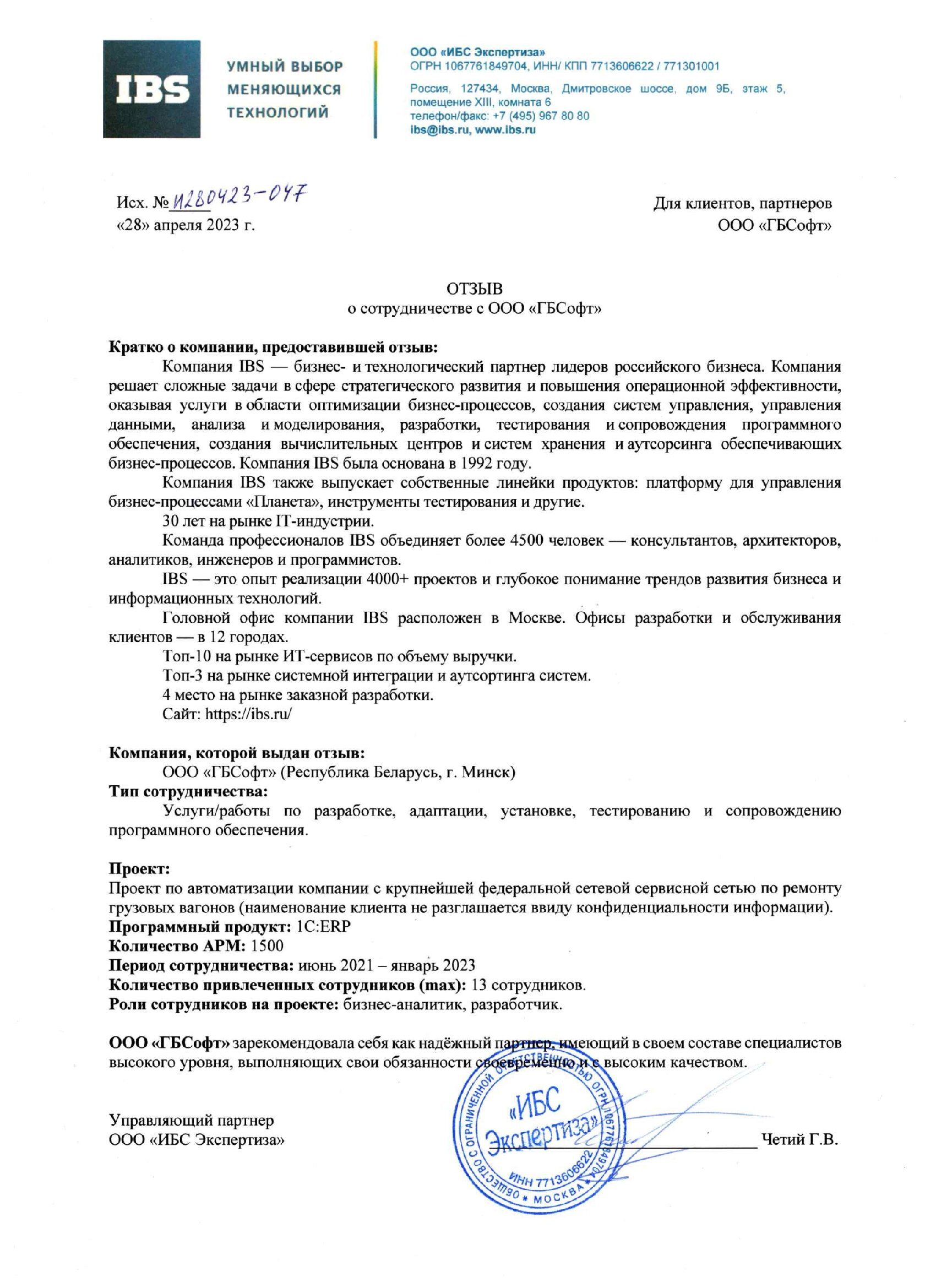 ООО "ИБС Экспертиза" благодарит IT-компанию ООО “ГБСофт” за реализацию проекта по автоматизации нашей компании. ГБСофт зарекомендовала себя как надежный партнер, имеющий в своем составе специалистов высокого уровня, выполняющих свои обьязанности своевременно и с высоким качеством.