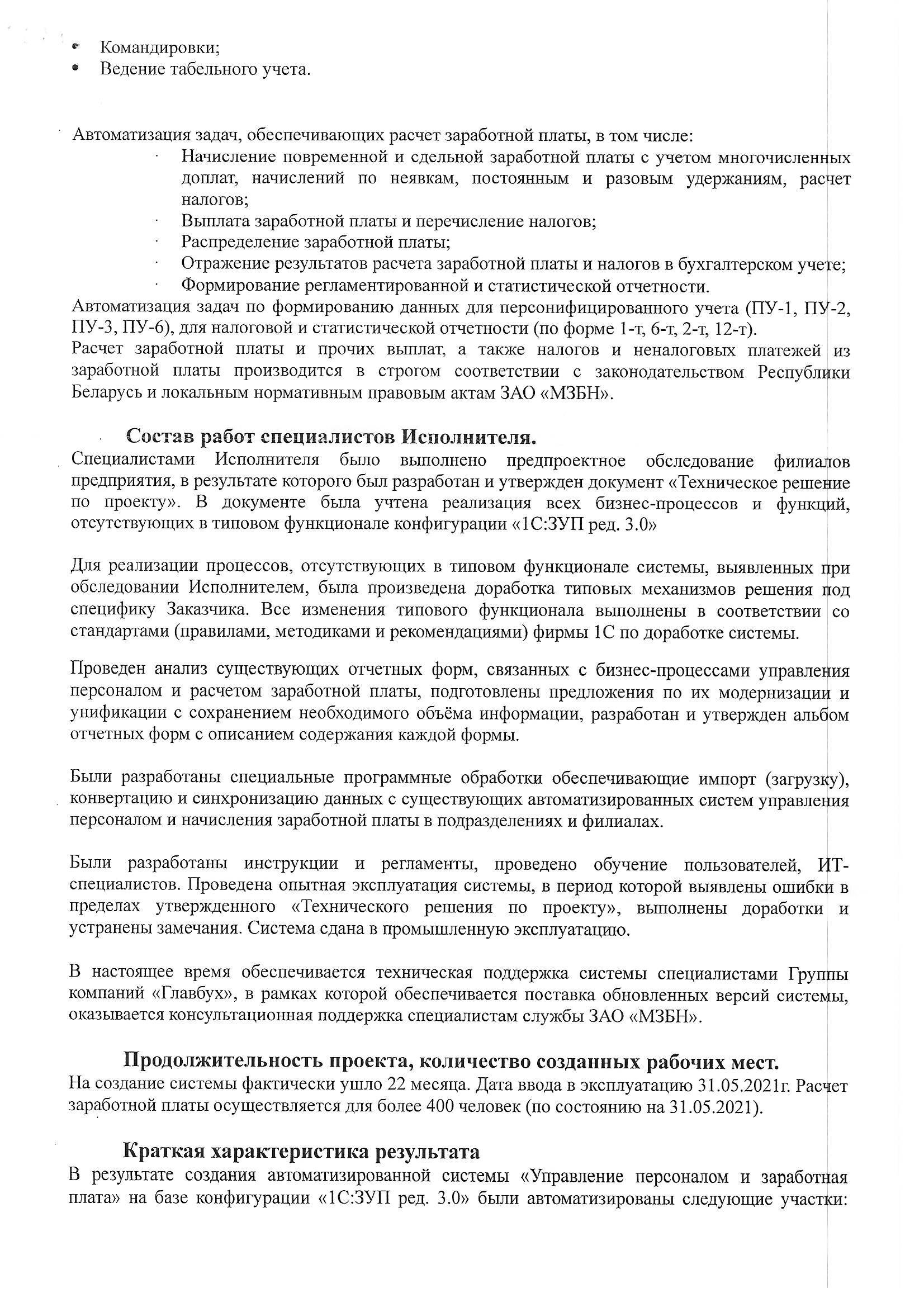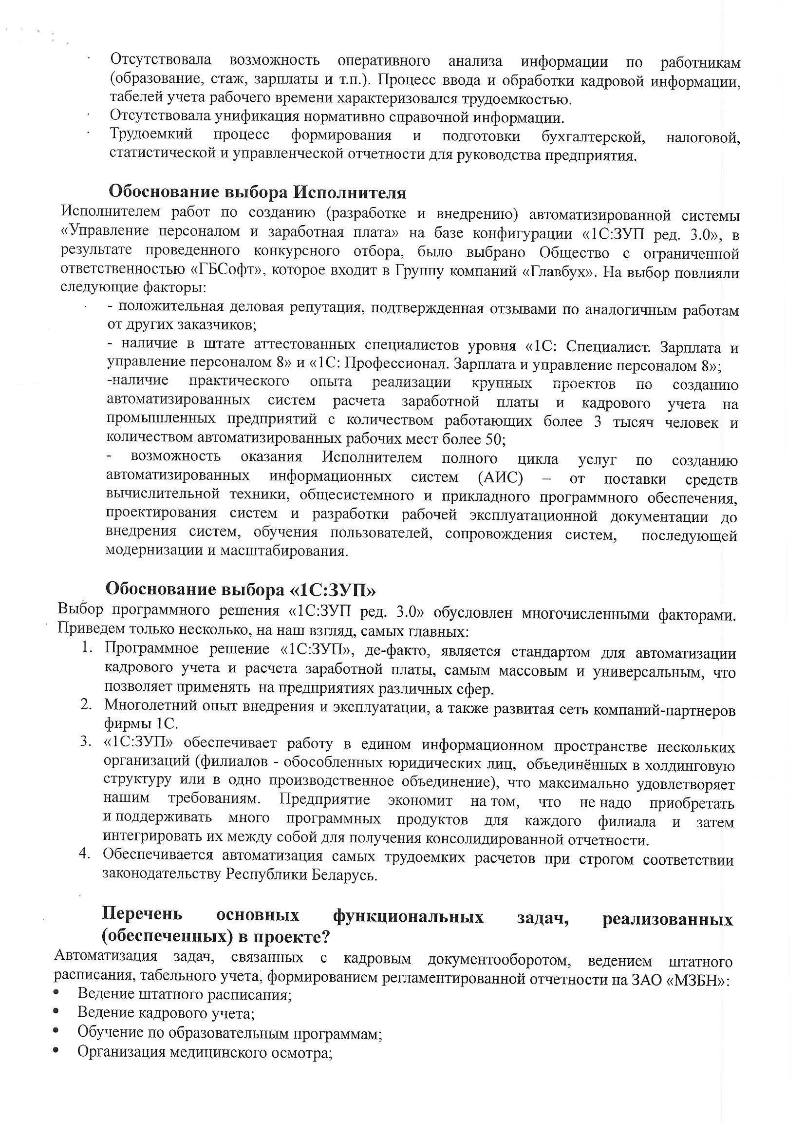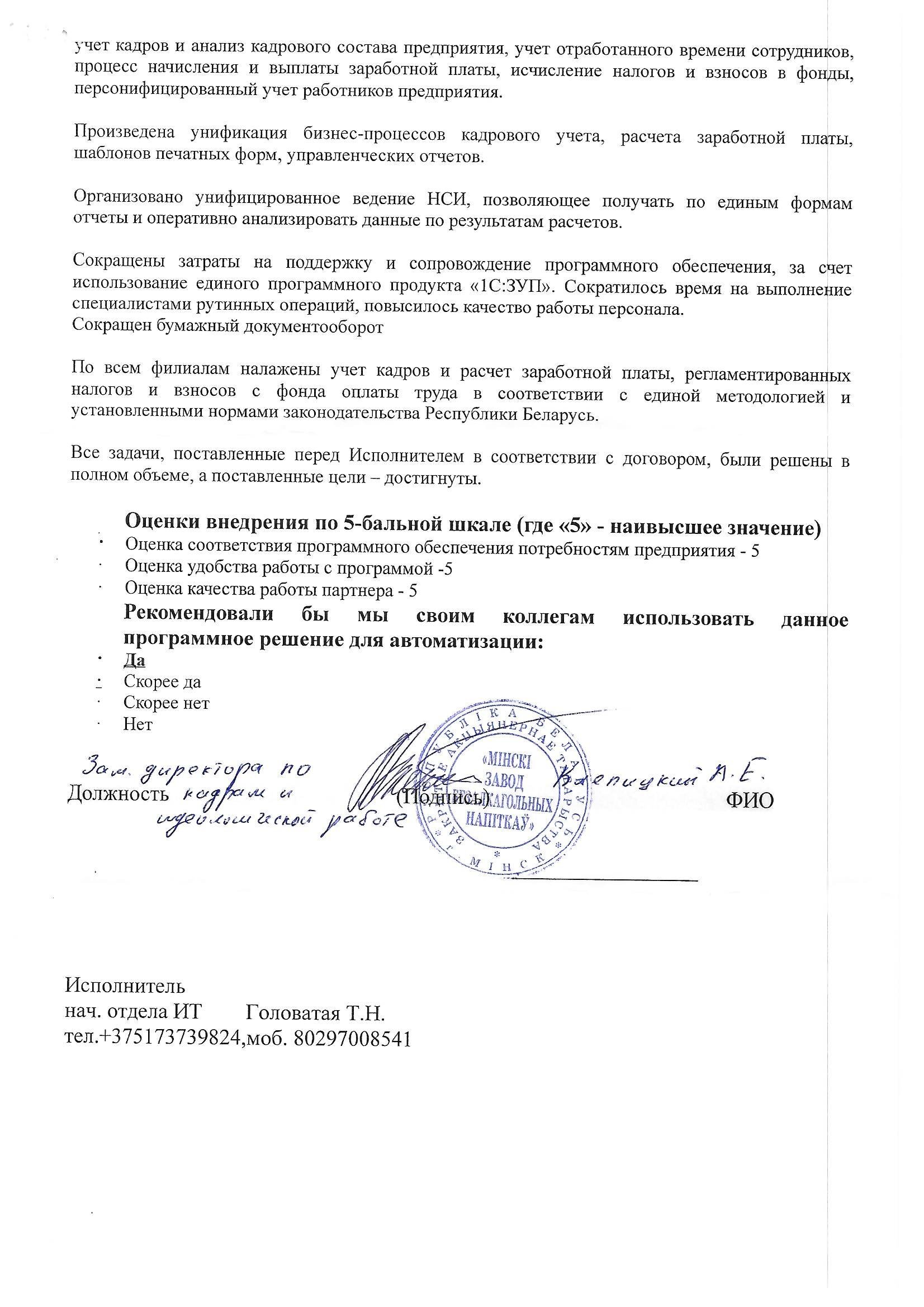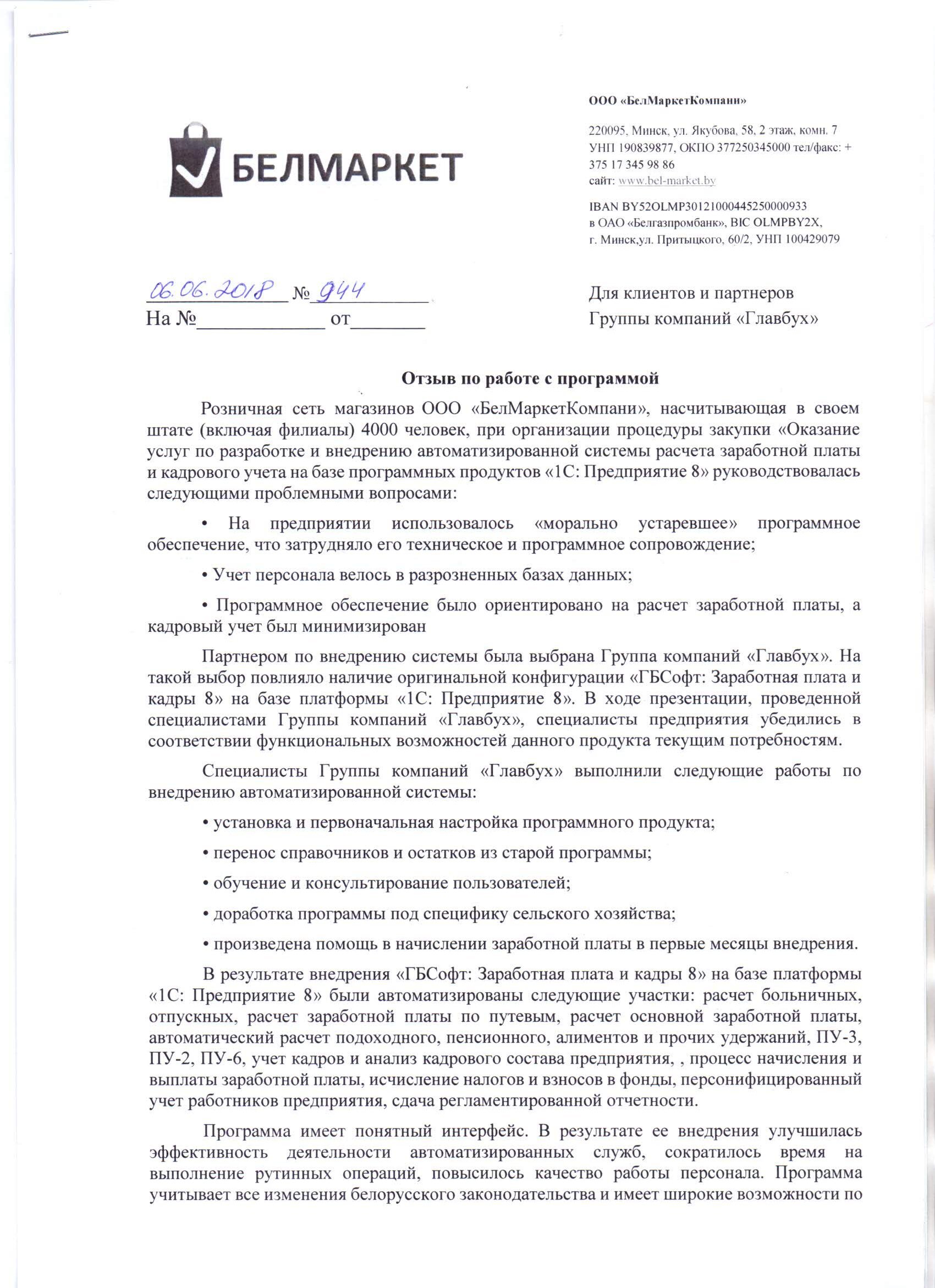 Благодарим компанию ООО "ГБСофт" за качественно оказанные услуги по автоматизации отдела заработной платы и кадров. С помощью программного продукта 1С:Предприятие 8. Зарплата и управление кадрами 3 для Беларуси, наше предприятие сократило бумажный документооборот и получило качественный учет кадров и расчет заработной платы. Рекомендуем специалистов ГБСофт - как профессионалов своего дела, а саму компанию - как надежного партнера.
