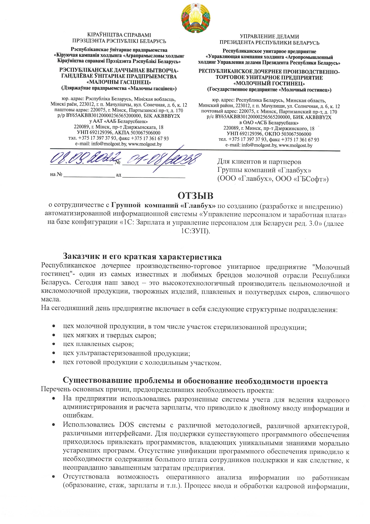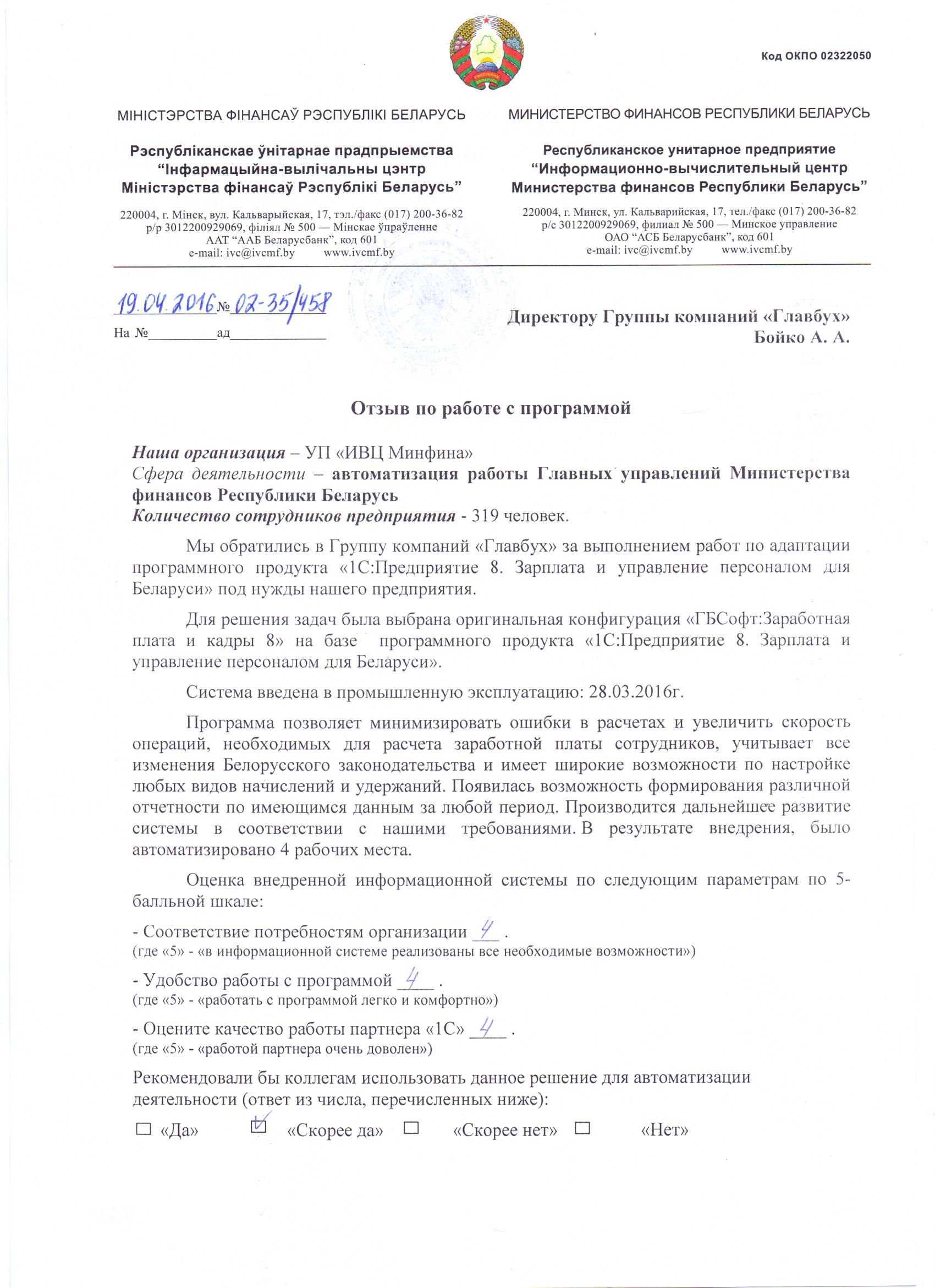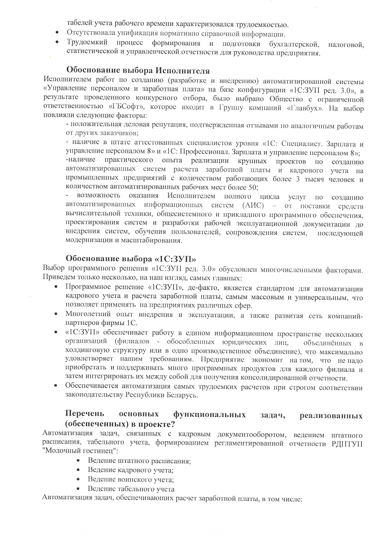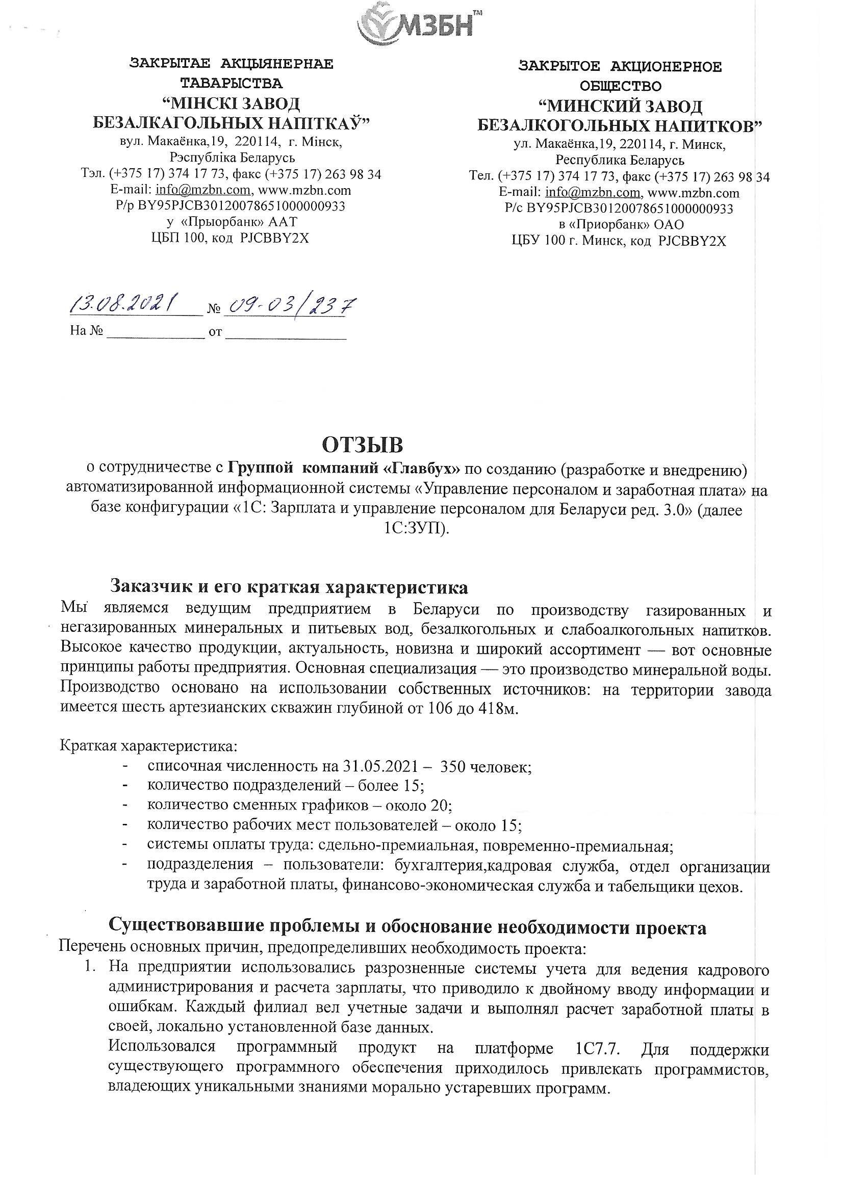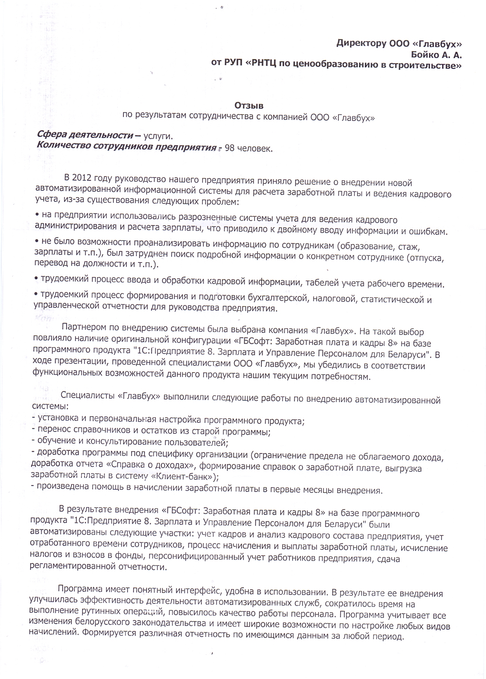 Благодарим компанию ООО "ГБСофт" за качественно оказанные услуги по автоматизации отдела заработной платы и кадров. С помощью программного продукта 1С:Предприятие 8. Зарплата и управление кадрами 3 для Беларуси, наше предприятие сократило бумажный документооборот и получило качественный учет кадров и расчет заработной платы. Рекомендуем специалистов ГБСофт - как профессионалов своего дела, а саму компанию - как надежного партнера.