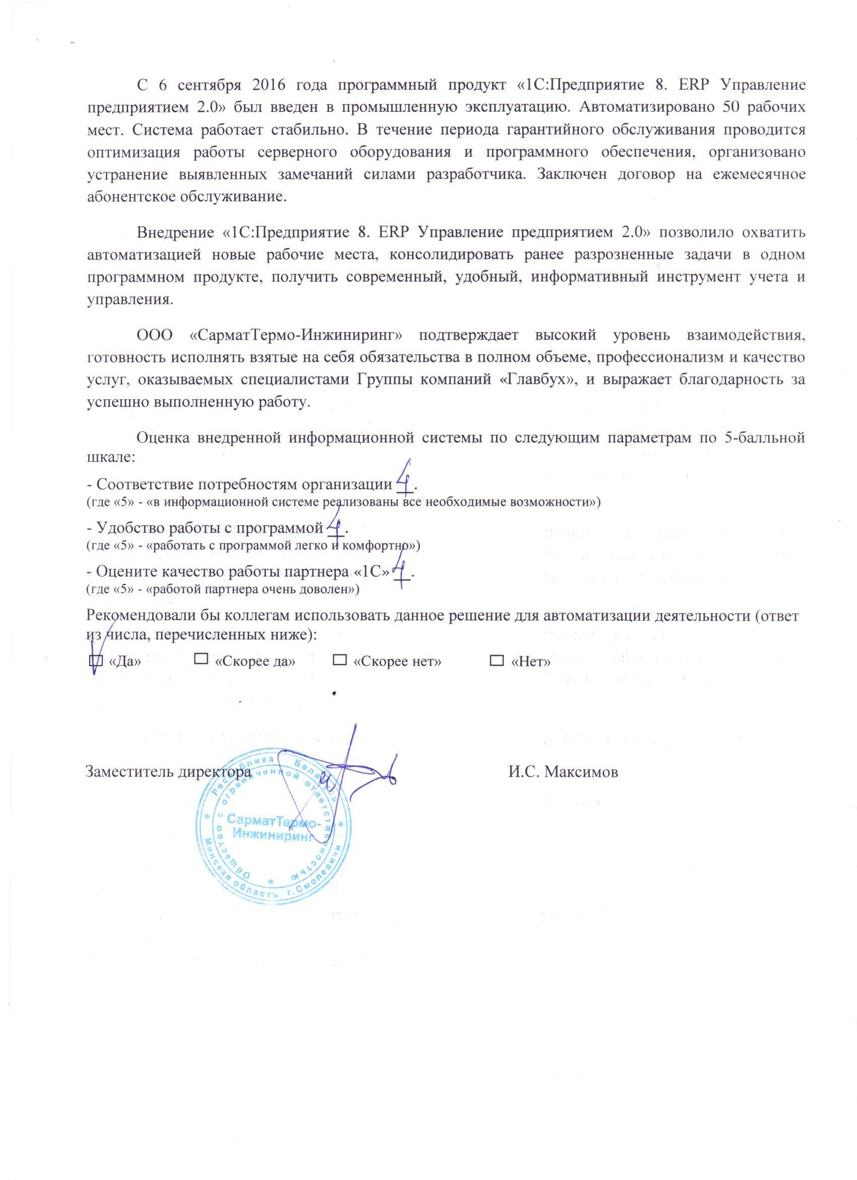 Группа компаний "Главбух" завершила работы по автоматизации предприятия ООО "СарматТермо-Инжиниринг" на базе программного средства "1С:Предприятие 8. ERP Управление предприятием 2 для Беларуси". Все поставленные перед нами задачи были выполнены в полном объёме. Благодаря этому, заказчик выделил профессионализм и качество оказываемых услуг группы компаний "Главбух".